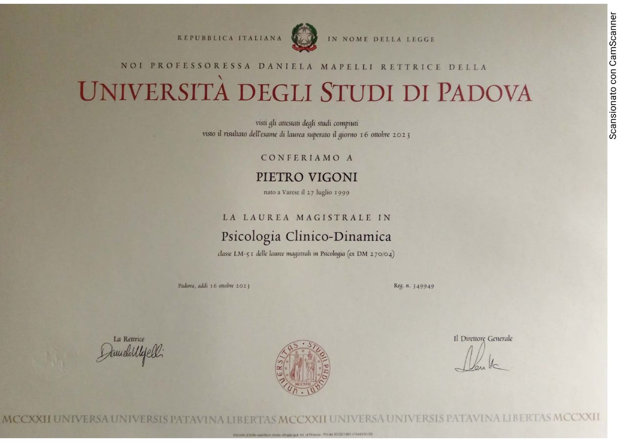 Sono il Dott. Pietro Vigoni, psicologo clinico iscritto all’Ordine delle Psicologhe e degli Psicologi del Veneto. Mi sono laureato in Psicologia Clinica-Dinamica presso l’Università di Padova, a cui sto affiancando una formazione in psicoterapia presso la Società Italiana di Psicoterapia Psicoanalitica.